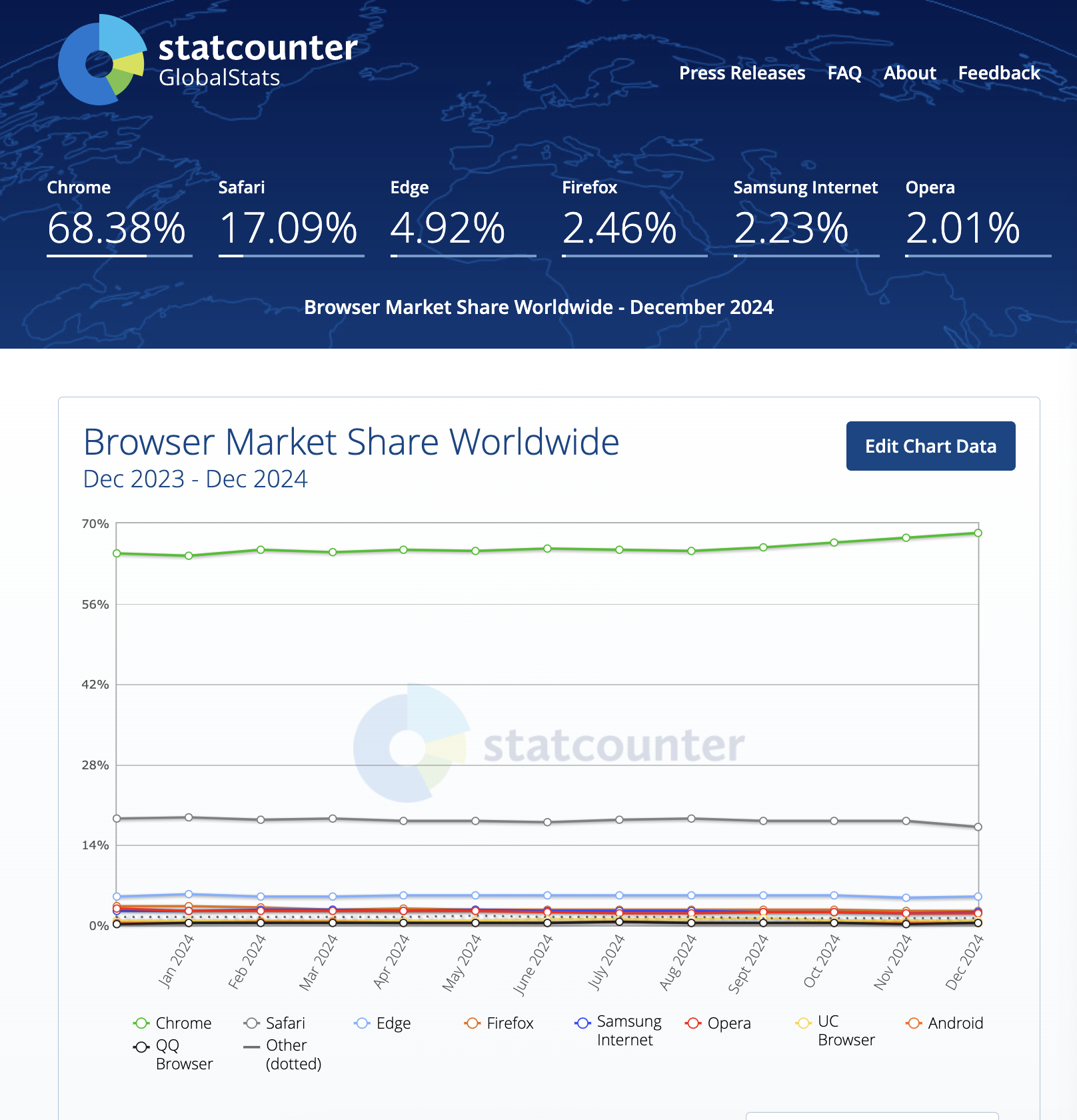 최근 인터넷 익스플로러, 파이어폭스, 사파리, 크롬, 오페라 이렇게 5개의 브라우저가 많이 사용되지만 파이어 폭스, 크롬, 사파리와 같은 오픈소스 브라우저를 예로 설명하고자 한다. 사파리는 부분적으로 오픈소스다. StatCounter 브라우저 통계에 따르면 2012년 3월 파이어폭스, 사파리, 크롬의 점유율이 62.57%에 달한다. 2025년 1월 기준 2023~2024 자료로는 크롬, 사파리, 마이크로소프트 엣지, 파이어폭스, 삼성 인터넷, 오페라 순으로 다음과 같은 점유율을 보인다.