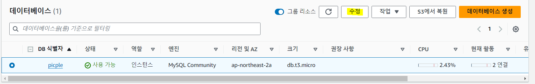 다 적용했으면 데이터베이스로 돌아가서 자신의 DB선택 후 수정 누르기.