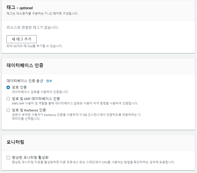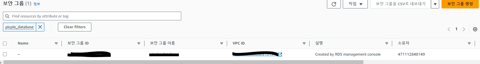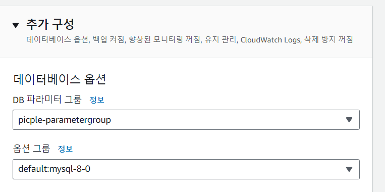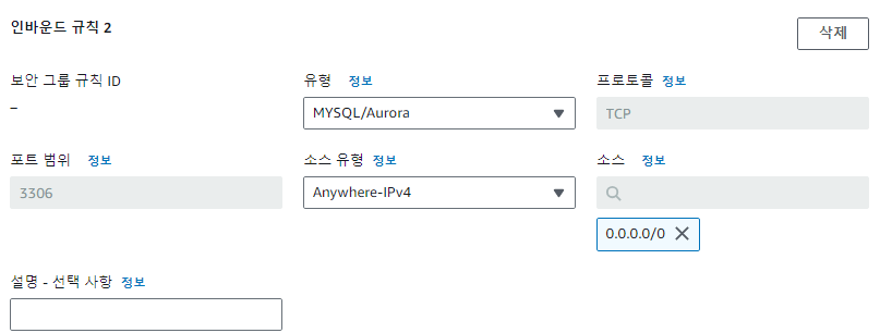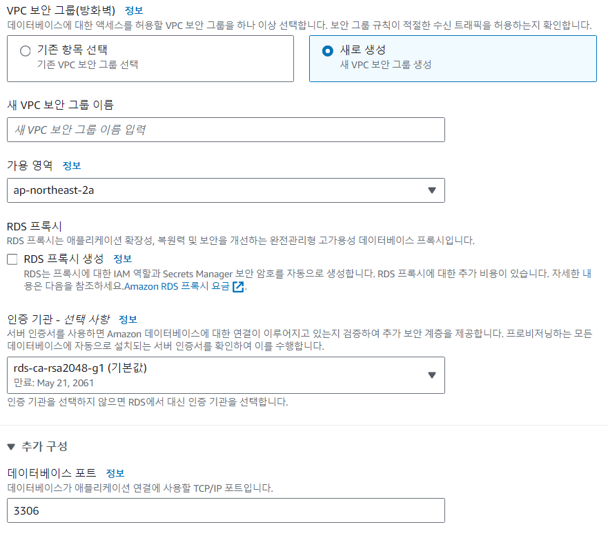 퍼블릭 엑세스는 예를 누르고 VPC보안그룹은 특정 그룹에 해당하는 경우에만 RDS 쓸 수 있게 하는 것이므로 새롭게 그룹 만들고 이름 작성하자. ~~_database가 무난하다