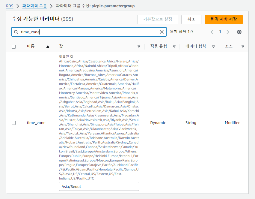 검색창에 time_zone 입력하고 Asia/Seoul 로 작성후 변경사항 저장