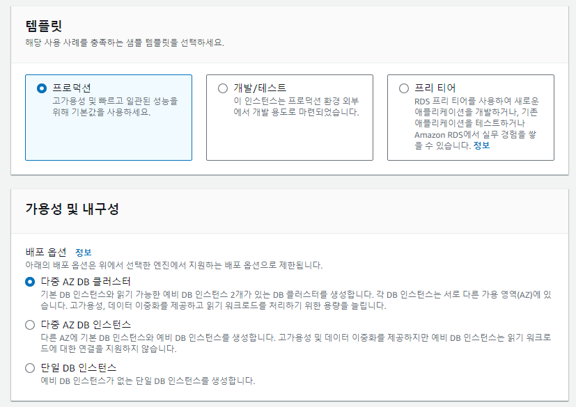 아마 프리티어 선택 시 아래 가용성에서 단일 DB 인스턴스가 고정될 것이다.
