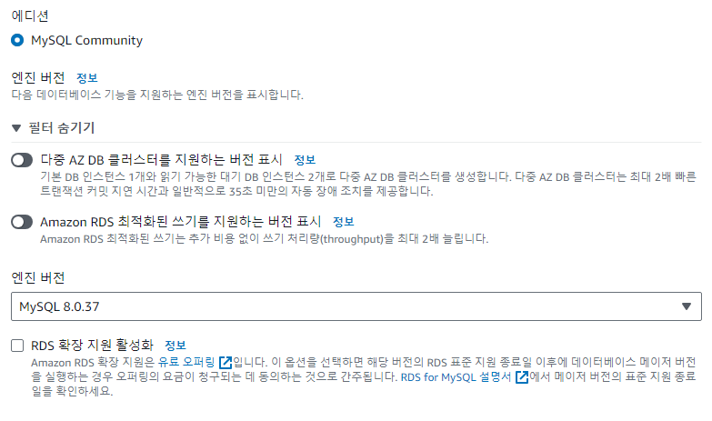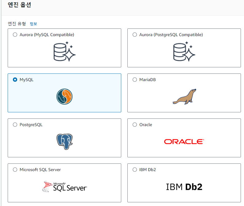 다음으로 사용하는 엔진 유형과 버전을 선택하자. 필자는 MySQL을 사용하고 있어 선택해 주었으며 버전도 선택하였다.