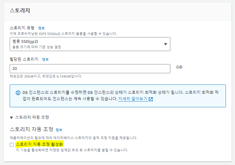 **스토리지 설정에서 과금 방지를 위해 프리티어 최대 사용량이 20GiB이므로 20GiB으로 변경하고 스토리지 자동 조정도 꼭 꺼주자. **