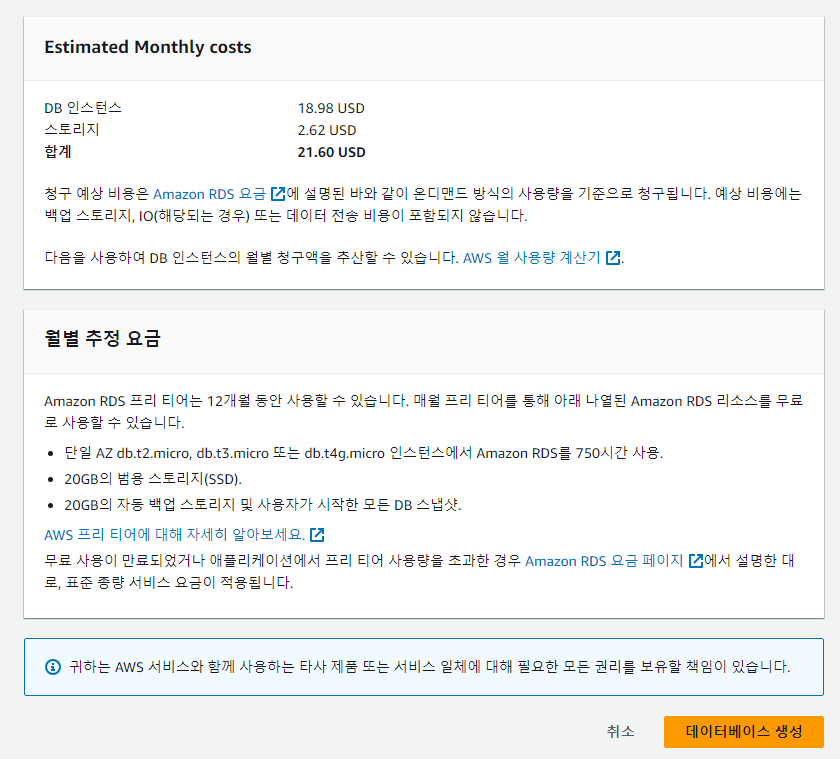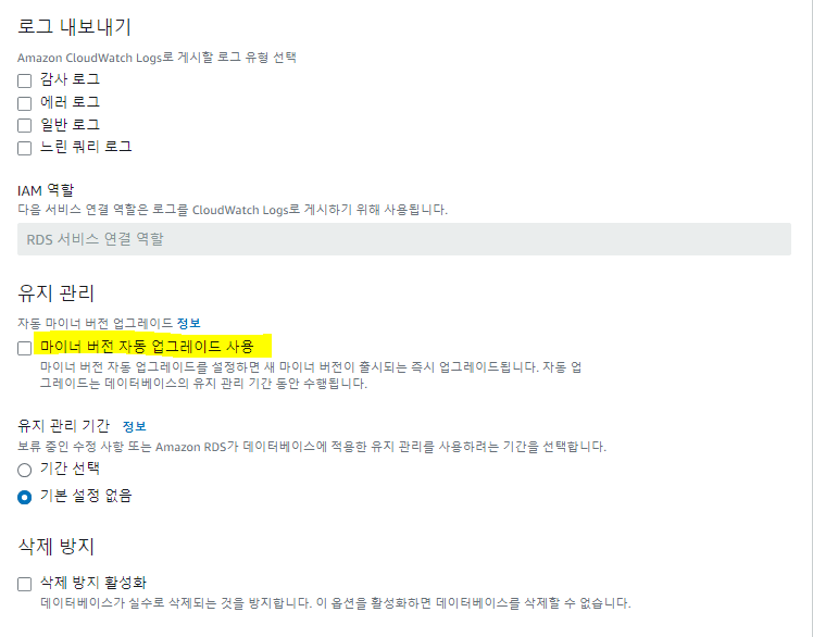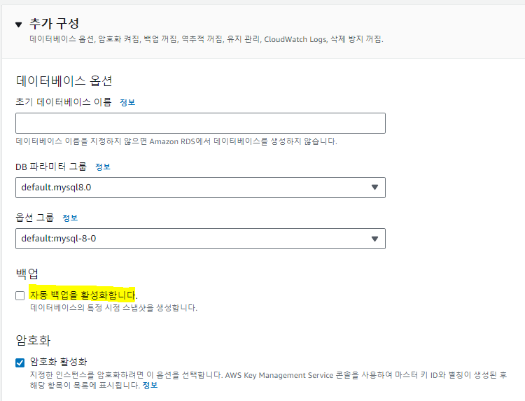 데이터베이스 추가 구성에서 20GB이상 스냅샷이 생성되면 프리티어라도 결제될 수 있기 때문에 자동 백업을 비활성화하자.
