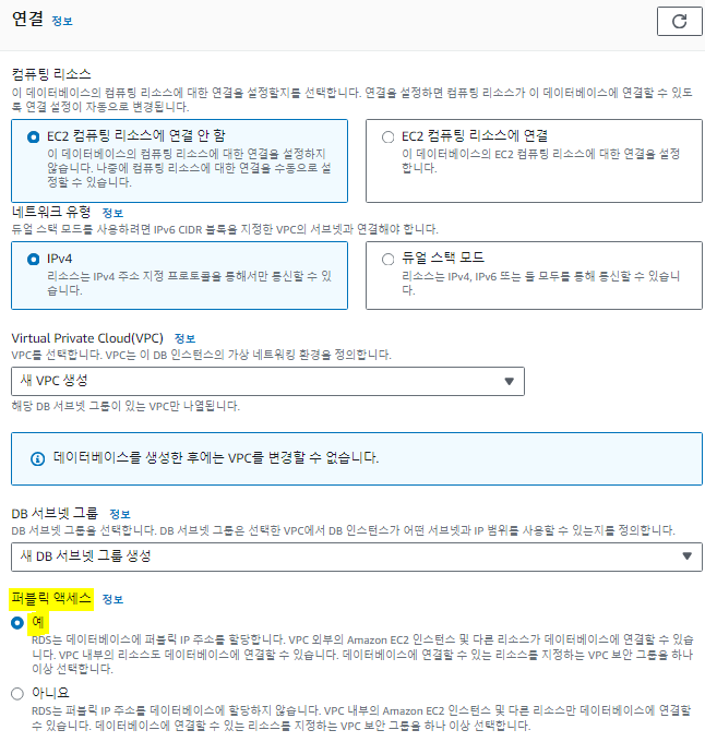 연결 설정 에서는 퍼블릭 액세스를 활성화하기 위해 EC2 컴퓨팅 리소스에 연결 안 함 을 선택한다. 나중에 VPC설정으로 EC2서버에서 RDS 접속 가능하다.