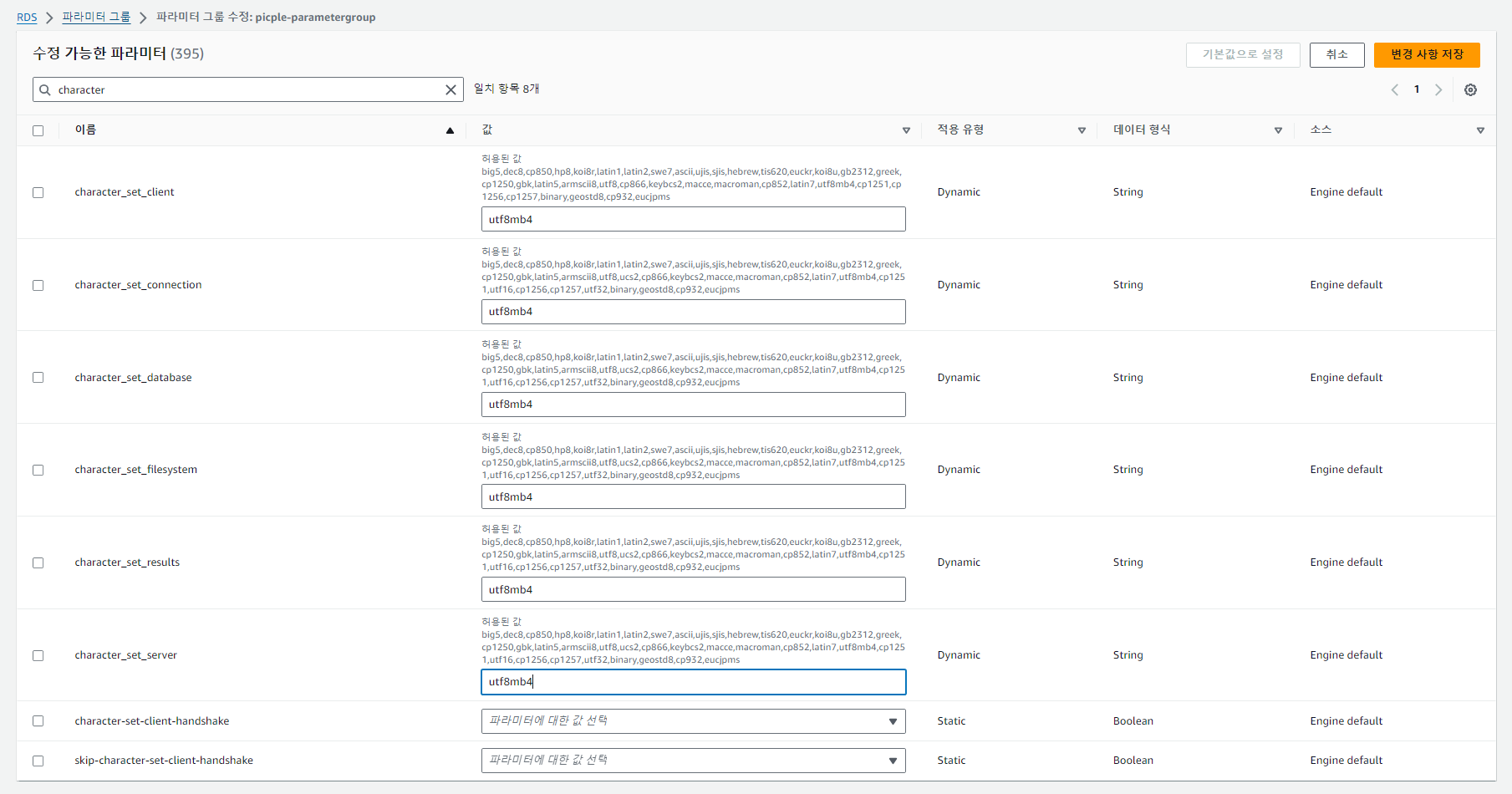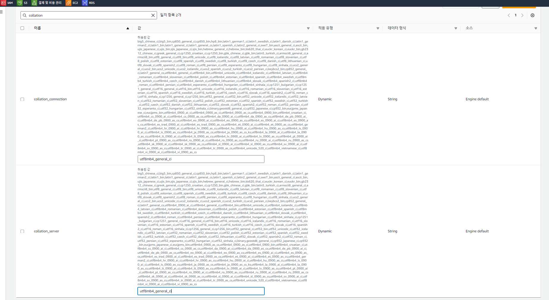 3. collation 검색창에 collation 입력하고 아래 2개 파라미터의 값을 utf8mb4_general_ci 로 작성후 변경사항 저장