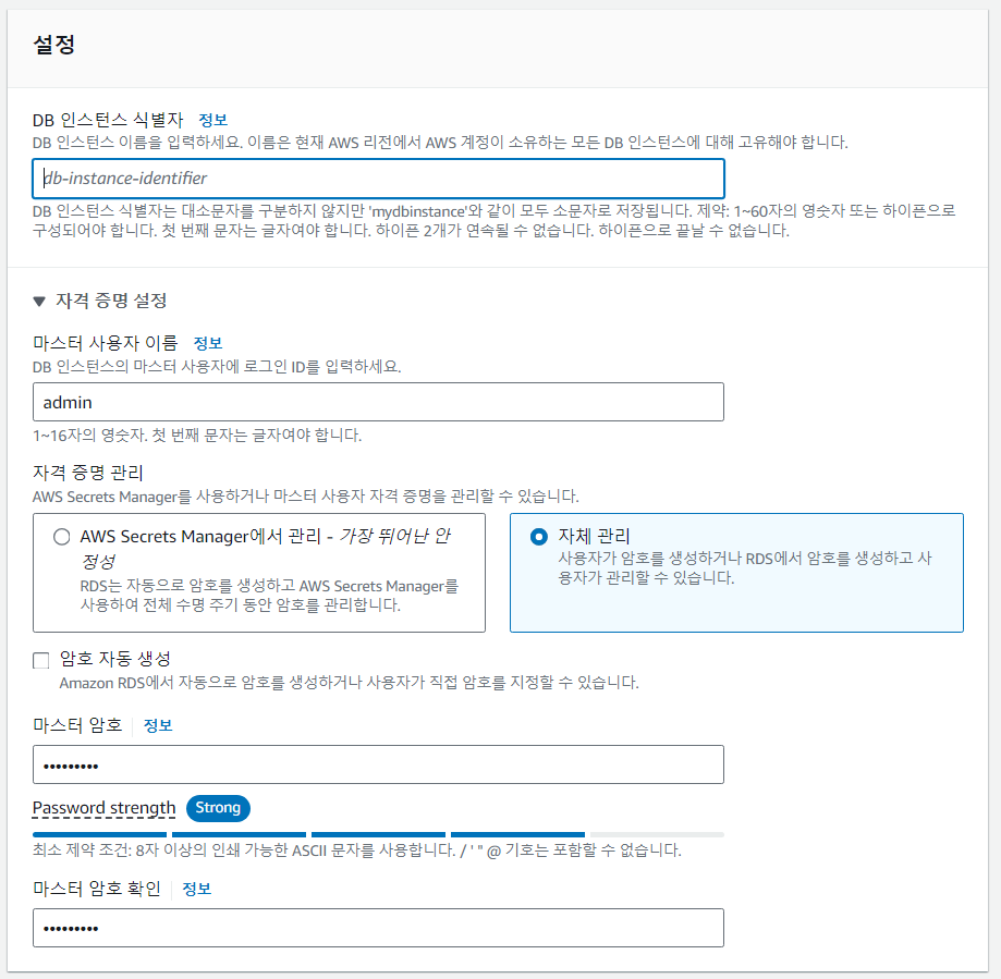 DB 인스턴스 설정으로 DB 인스턴스 식별자와 자격 증명 설정을 하도록 하자. 식별자 이름을 작성하고 필요하다면 암호를 만들면 된다.