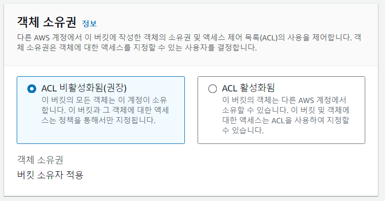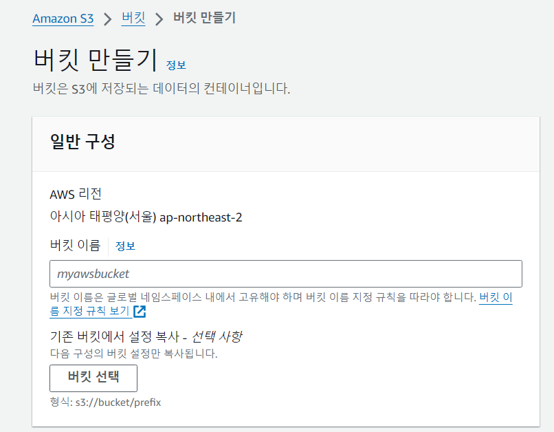 중복되지 않는 버킷 이름을 작성하고 언하는 리전을 선택(오른쪽 상단 닉네임 왼쪽에서 설정 가능)