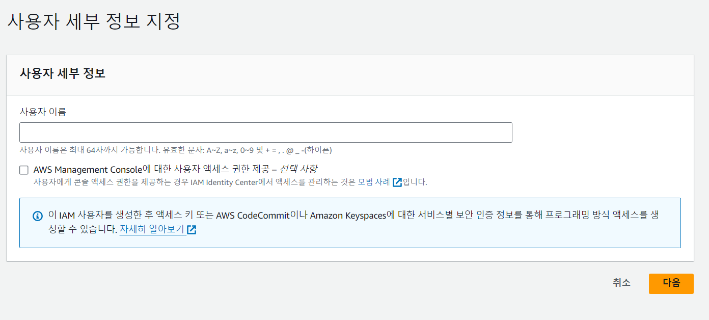 IAM사용자를 생성해 S3접근 권한을 부여해야한다. 엑세스키와 시크릿키를 사용하기 때문에 꼭 저장하고 이 값은 절대 외부에 노출되어선 안되니 주의해야한다.