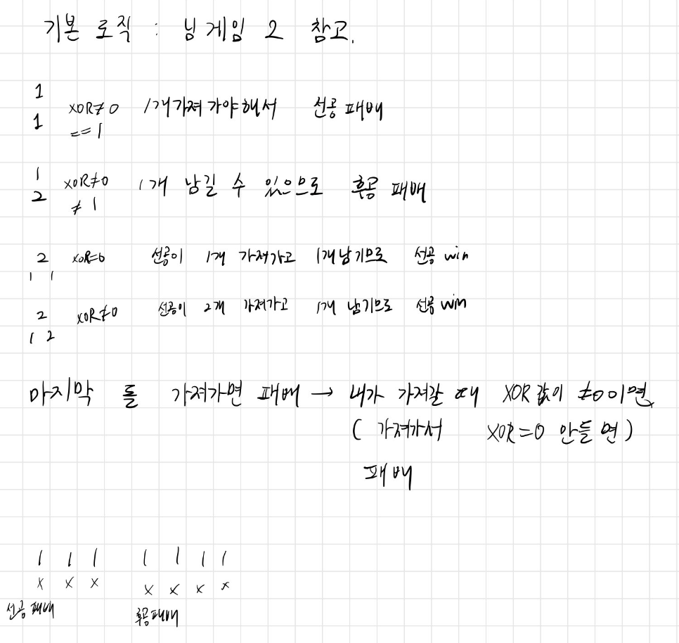 koosaga와 cubelover가 님 게임을 하고 있다. 님 게임은 돌을 차곡 차곡 위로 쌓아올린 돌 더미 k개를 이용한다. 각각의 돌 더미에는 한 개 이상의 돌이 있다. 두 사람은 서로 턴을 번갈아가면서 님 게임을 진행한다. 각 사람의 턴이 되면, 돌이 있는 돌 더미를 하나 선택하고, 그 돌 더미에서 돌을 하나 이상 제거한다. 전체 돌 더미에서 마지막 돌을 제거하는 사람이 게임을 지게 된다.