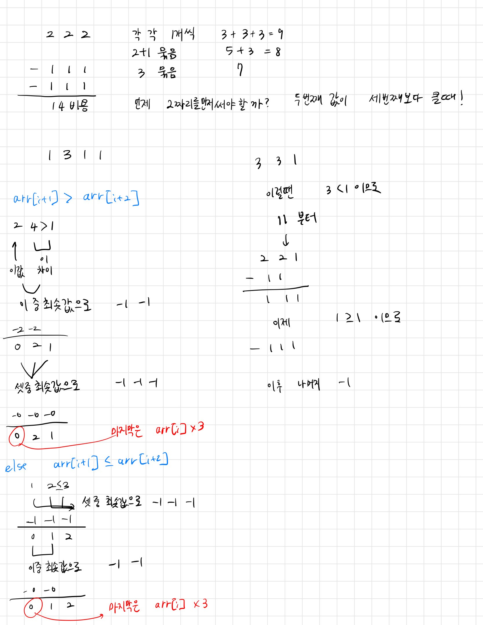 각 위치에서 어떤 연산을 먼저 수행하는 것이 최적인지를 판단해야 한다. 각 위치 i에서 현재 수 arr[i]를 0으로 만들어야 한다. a[i+1]과 a[i+2]를 비교하여 두 가지 경우로 나눌 수 있다.