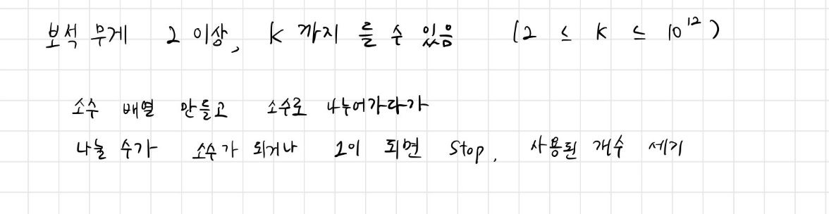 무조건 K만큼 들어야하므로 나눗셈을 적용했다. 나눌 수 없는수는 소수이므로 소수로 계속 나누어주었다.