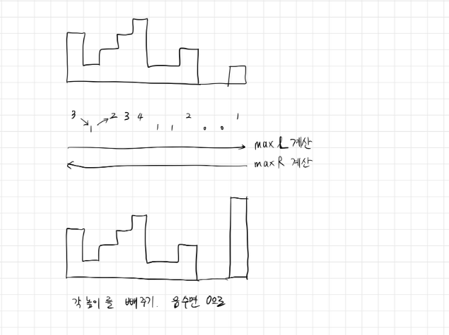 각 위치에서 좌우 최대높이를 저장한 뒤, 그 중 작은 값을 기준으로 물이 고이게 된다. 그리고 고이는 양은 그 위치에서의 높이를 빼주면 된다. 이때 그 위치에서의 높이가 더 크면 고이는 물의 양이 음수로 계산되므로 이를 음수가 아닌 0으로 처리하면 고이지 않는다고 계산이 된다.