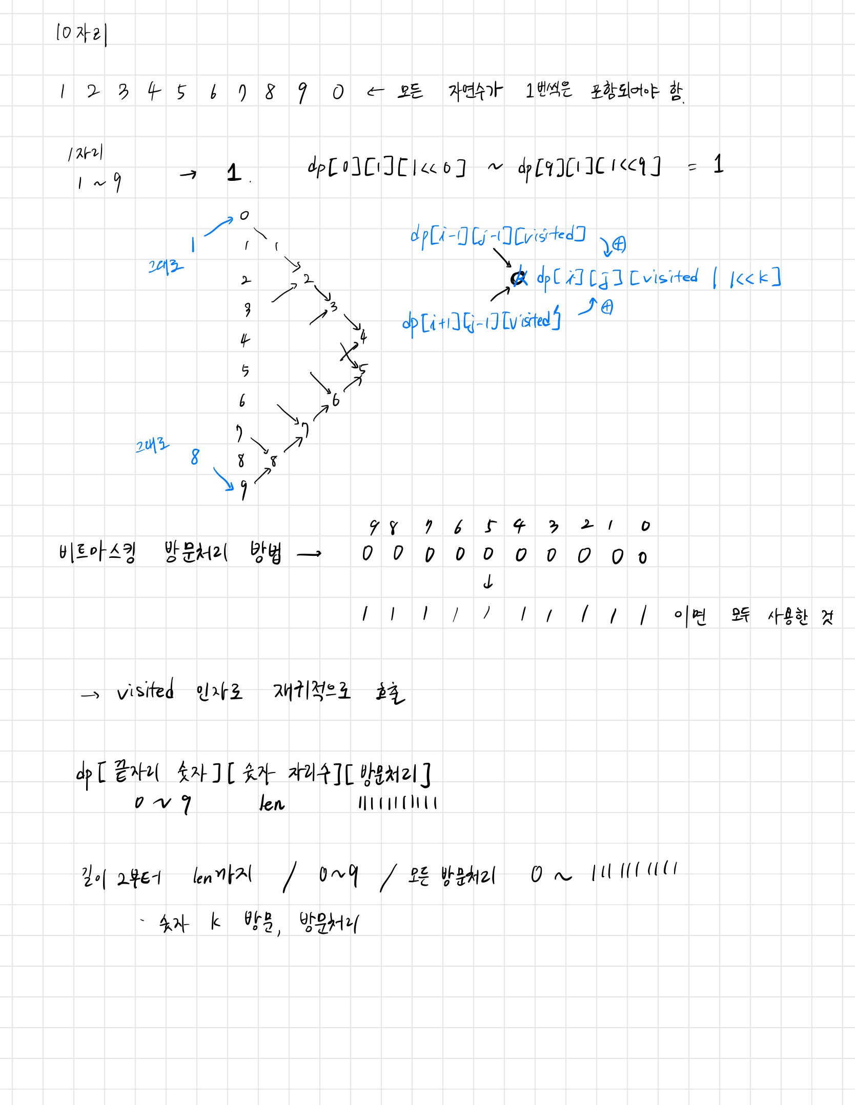 ans += dp[i][len][(1 << 10) - 1];// 여기 %MOD넣으면 1e9넘는 값 더할때 이상하게 더해져서 long으로 큰 값 더해놓고 마무리로 나머지 구하기