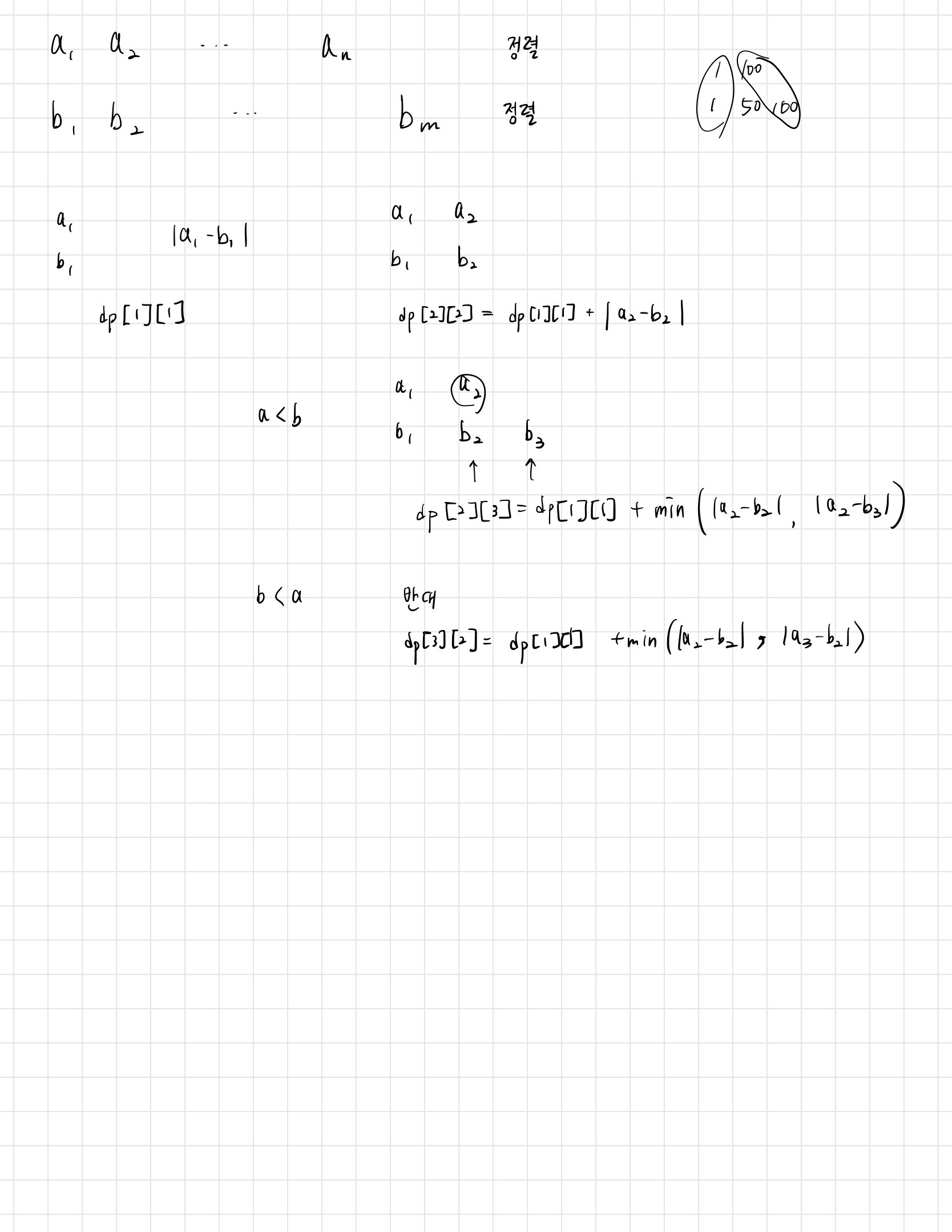 풀이가 꽤 난해했다. 인원 짝이 맞으면 정렬해서 다 연결하면 되겠지만 그게 안된다. N과 M이 달라 그때그때 최적의 선택을 해줘야하면서 모든 경우의 수를 고려해야한다. 일단 같은 개수일 땐 이전 1명씩 덜 골랐을때 최적값에서 이번 차이를 더한다. 그러나 인원수 차이날땐 예를들어 i > j일때 이번에 i를 안 고른 최적값인 dp[i-1][j]값이 최적일수도 있고, 혹은 둘 다 안고른 상태에서 이번의 차이를 더해주는 dp[i-1][j-1] + 차이값이 최적일수도 있다. 이를 모두 고려해야한다.