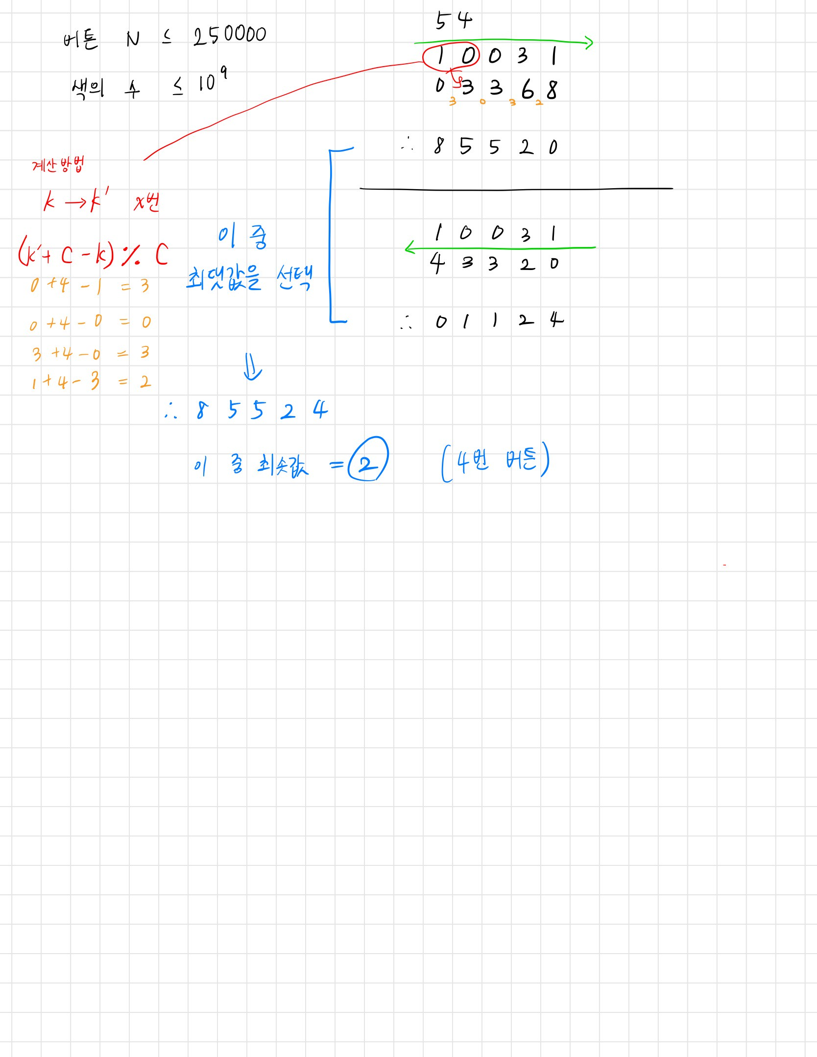 이때 현재 색깔이 x인 한 버튼을 누르면 누른 버튼과 함께 해당 버튼의 양옆으로 같은 색으로 연속해서 이어진 모든 버튼이 (x+1)%C 번 색깔로 변한다. 우리의 목표는 버튼을 누르는 횟수를 최소화하며 모든 버튼을 같은 색깔로 만드는 것이다.
