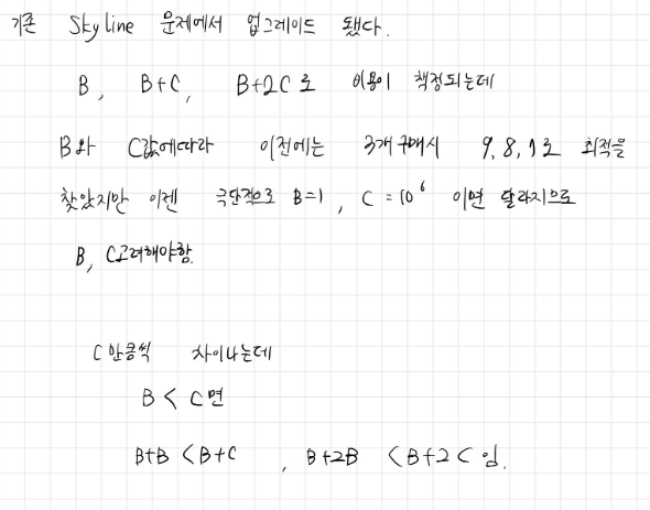 - i번 공장과 (i+1)번 공장, (i+2)번 공장에서 각각 라면을 하나씩 구매한다(1 ≤ i ≤ N-2). 이 경우 비용은 (B+2C)원이 든다.