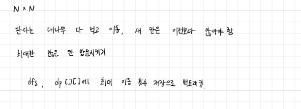 n × n의 크기의 대나무 숲이 있다. 욕심쟁이 판다는 어떤 지역에서 대나무를 먹기 시작한다. 그리고 그 곳의 대나무를 다 먹어 치우면 상, 하, 좌, 우 중 한 곳으로 이동을 한다. 그리고 또 그곳에서 대나무를 먹는다. 그런데 단 조건이 있다. 이 판다는 매우 욕심이 많아서 대나무를 먹고 자리를 옮기면 그 옮긴 지역에 그 전 지역보다 대나무가 많이 있어야 한다.