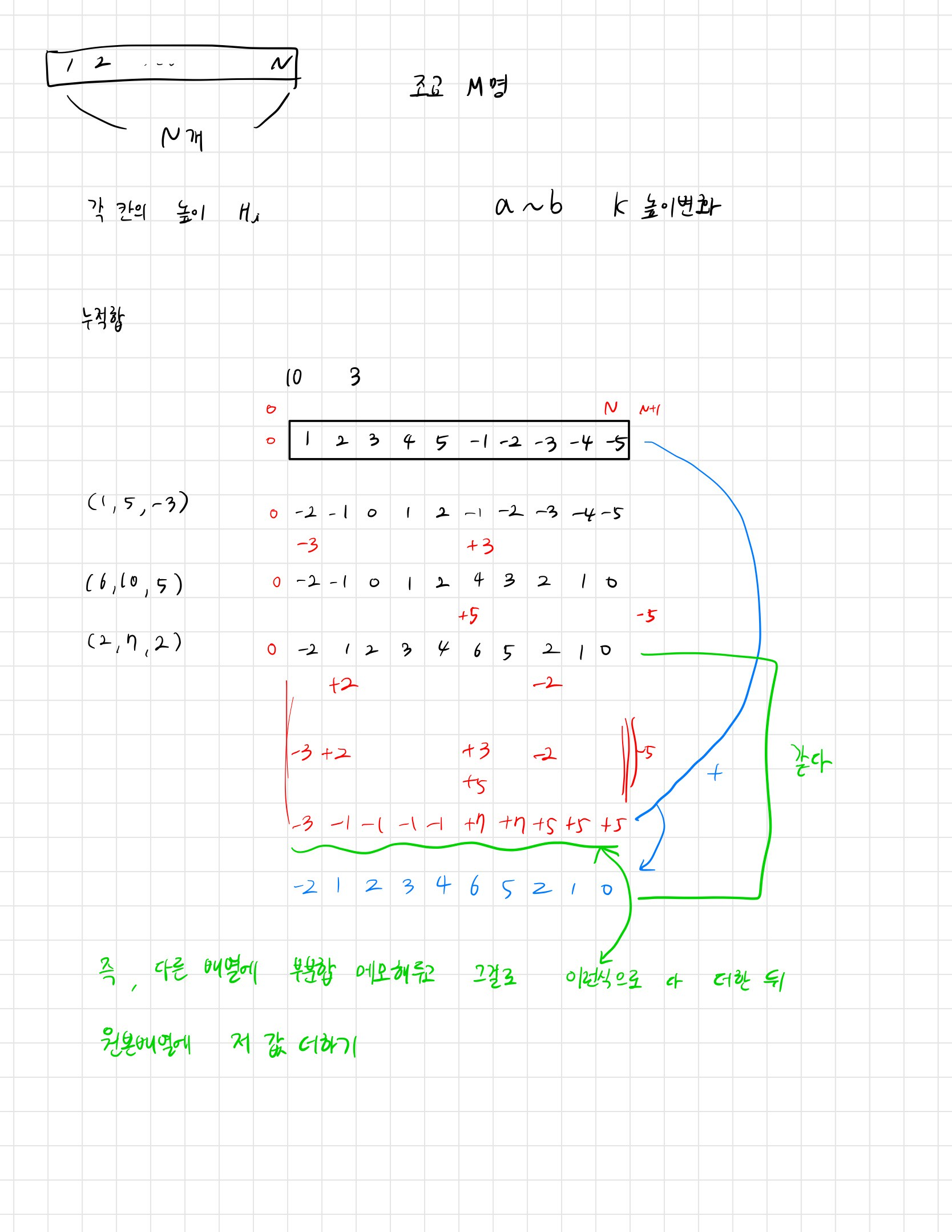 연병장은 일렬로 이어진 N개의 칸으로 이루어져 있으며 각 칸마다 높이를 가지고 있고, 첫 번째 칸부터 순서대로 1번, 2번, 3번, ..., N번 칸으로 명칭이 붙어있다. 조교들은 총 M명이 있으며, 각 조교들은 태상이에게 a번 칸부터 b번 칸까지 높이 k만큼 흙을 덮거나 파내라고 지시한다. 흙은 주변 산에서 얼마든지 구할 수 있으므로 절대로 부족하지 않다.