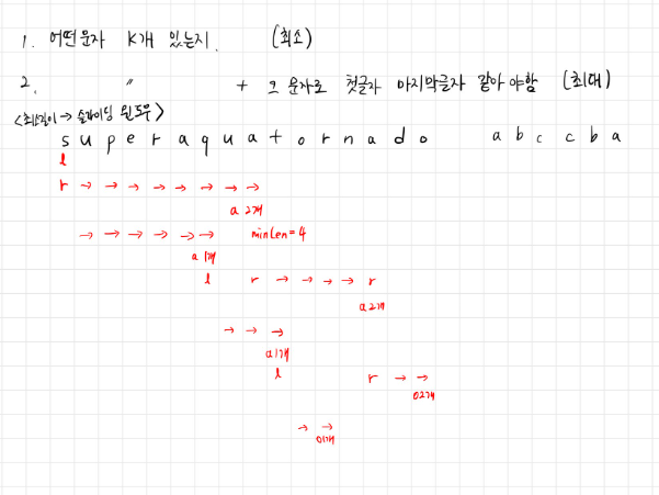 - 어떤 문자가 정확히 K번 등장하면 최소 길이를 갱신하고 윈도우를 축소