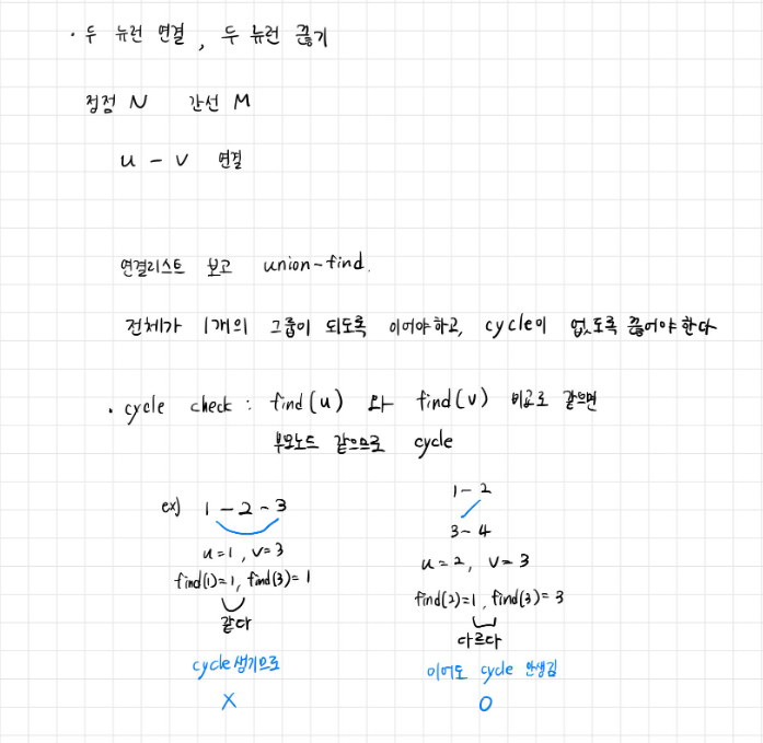 그림처럼 사이클은 끊고, 연결되지 않은 그룹은 이어주는 연산을 세면 되는데 딱 필요한 알고리즘이 union-find라고 생각했고, 사이클을 어떻게 셀까 고민하던 찰나 find함수로 두 함수의 부모노드가 일치하는지만 비교하면 된다고 생각했다. 이걸 몰랐다면 dfs든 뭐든 연결리스트를 다 저장해놓고 돌면서 탐색을 해야할것이다.