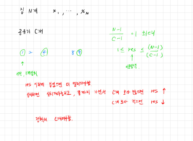 도현이는 언제 어디서나 와이파이를 즐기기 위해서 집에 공유기 C개를 설치하려고 한다. 최대한 많은 곳에서 와이파이를 사용하려고 하기 때문에, 한 집에는 공유기를 하나만 설치할 수 있고, 가장 인접한 두 공유기 사이의 거리를 가능한 크게 하여 설치하려고 한다.