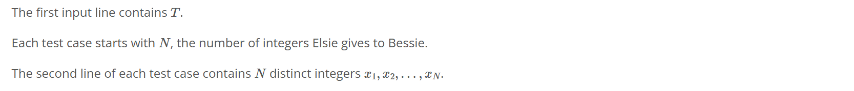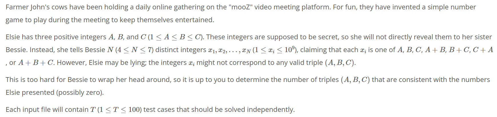 For each test case, output the number of triples $(A,B,C)$ that are consistent with the numbers Elsie presented.