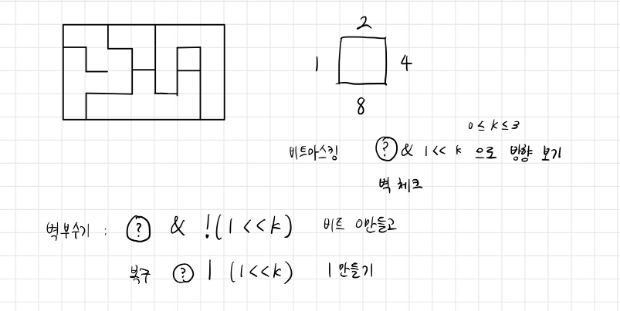 첫째 줄에 두 정수 N, M이 주어진다. 다음 M개의 줄에는 N개의 정수로 벽에 대한 정보가 주어진다. 벽에 대한 정보는 한 정수로 주어지는데, 서쪽에 벽이 있을 때는 1을, 북쪽에 벽이 있을 때는 2를, 동쪽에 벽이 있을 때는 4를, 남쪽에 벽이 있을 때는 8을 더한 값이 주어진다. 참고로 이진수의 각 비트를 생각하면 쉽다. 따라서 이 값은 0부터 15까지의 범위 안에 있다.