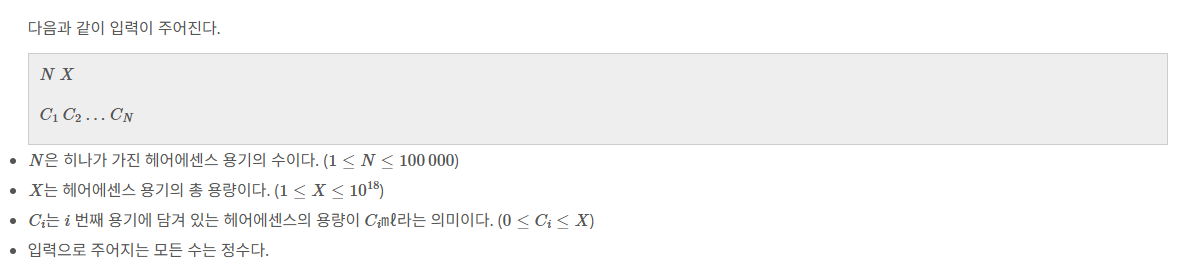 한별이의 화장품 가게 단골인 히나는 이제까지 사모은 헤어에센스 용기가 $N$ 개 있다. $i$ 번째 용기에는 헤어에센스가 $C_i$㎖ 담겨 있다. 히나는 한별이의 화장품 가게에 적당한 순서로 헤어에센스를 교환해서 용량이 꽉 찬, 즉, $X$㎖가 담겨 있는 헤어에센스 용기를 최대한 많이 만들고 싶다. 히나가 용량이 꽉 찬 헤어에센스를 최대 몇 개 만들 수 있는지 알려주자.