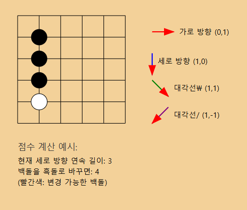 - 한쪽에만 흑돌이 있는 경우: 해당 방향의 연속된 길이 + 1