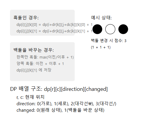 r, c: 현재 위치direction: 탐색 방향 (0:가로, 1:세로, 2:대각선, 3:대각선/)changed: 백돌을 바꾼 여부 (0:안바꿈, 1:바꿈)1