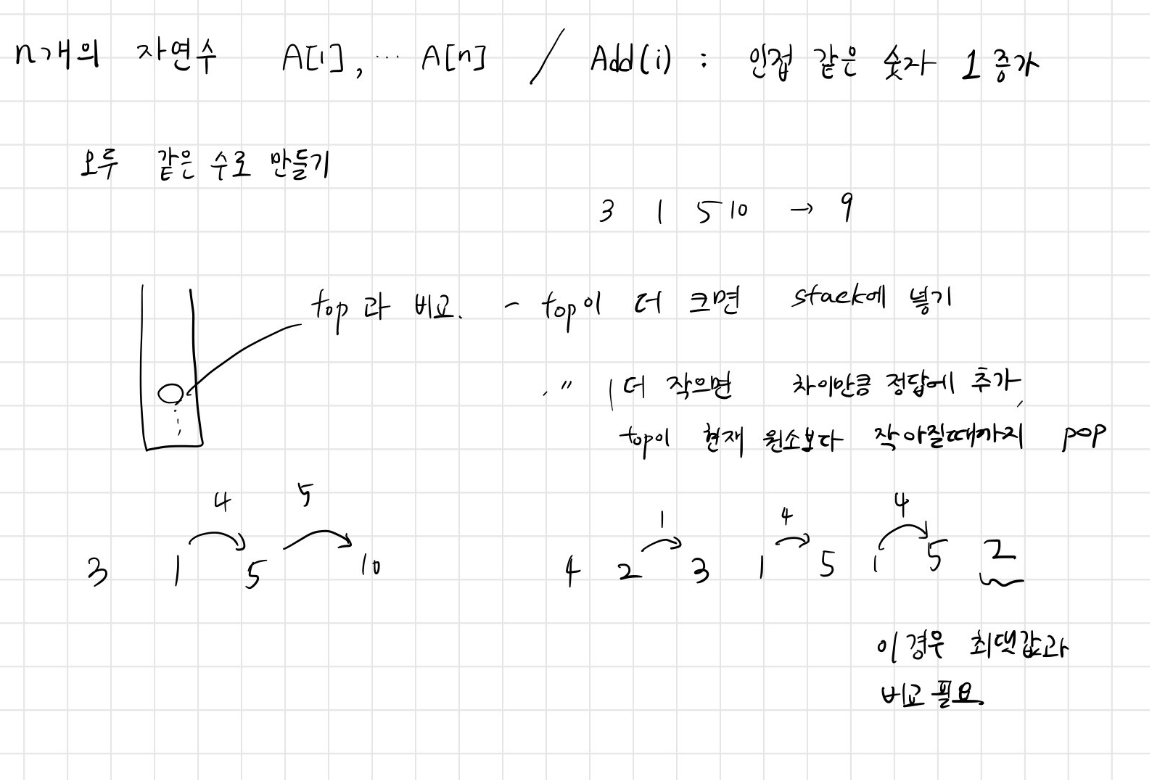 n(1 ≤ n ≤ 1,000)개의 자연수 A[1], A[2], A[3], …, A[n]이 있다. 이 자연수에 Add(i)라는 연산을 하면, A[i]가 1만큼 증가한다. 이때, A[i]만 증가하는 것이 아니고, A[i]의 좌우로 인접한 같은 수의 그룹이 한번에 1씩 증가한다. A[1]과 A[n]은 인접해 있지 않다.