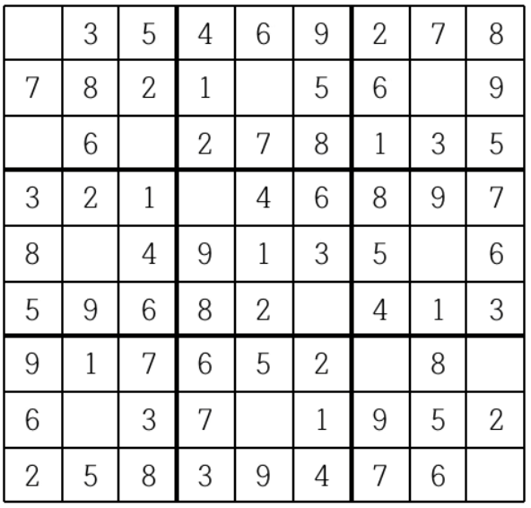 아홉 줄에 걸쳐 한 줄에 9개씩 게임 시작 전 스도쿠판 각 줄에 쓰여 있는 숫자가 한 칸씩 띄워서 차례로 주어진다. 스도쿠 판의 빈 칸의 경우에는 0이 주어진다. 스도쿠 판을 규칙대로 채울 수 없는 경우의 입력은 주어지지 않는다.