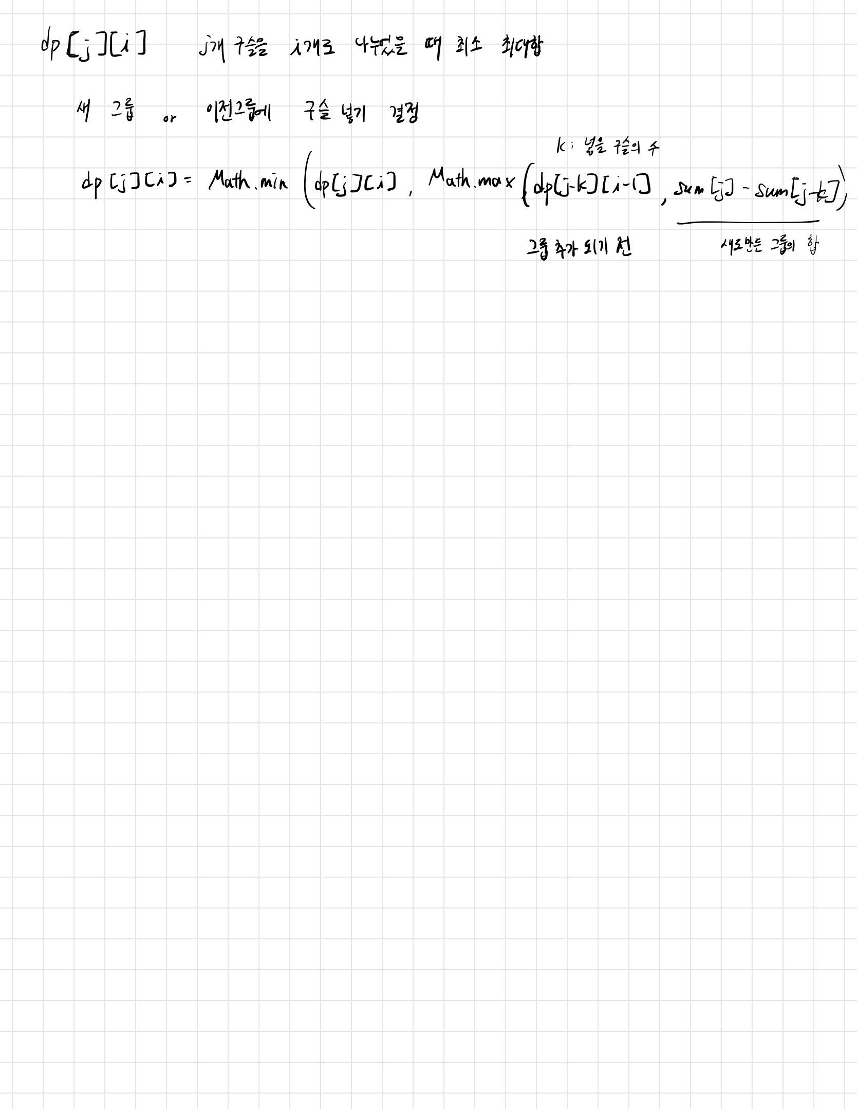 dp[j][i] = Math.min(dp[j][i], Math.max(dp[j - k][i - 1], sum[j] - sum[j - k]));