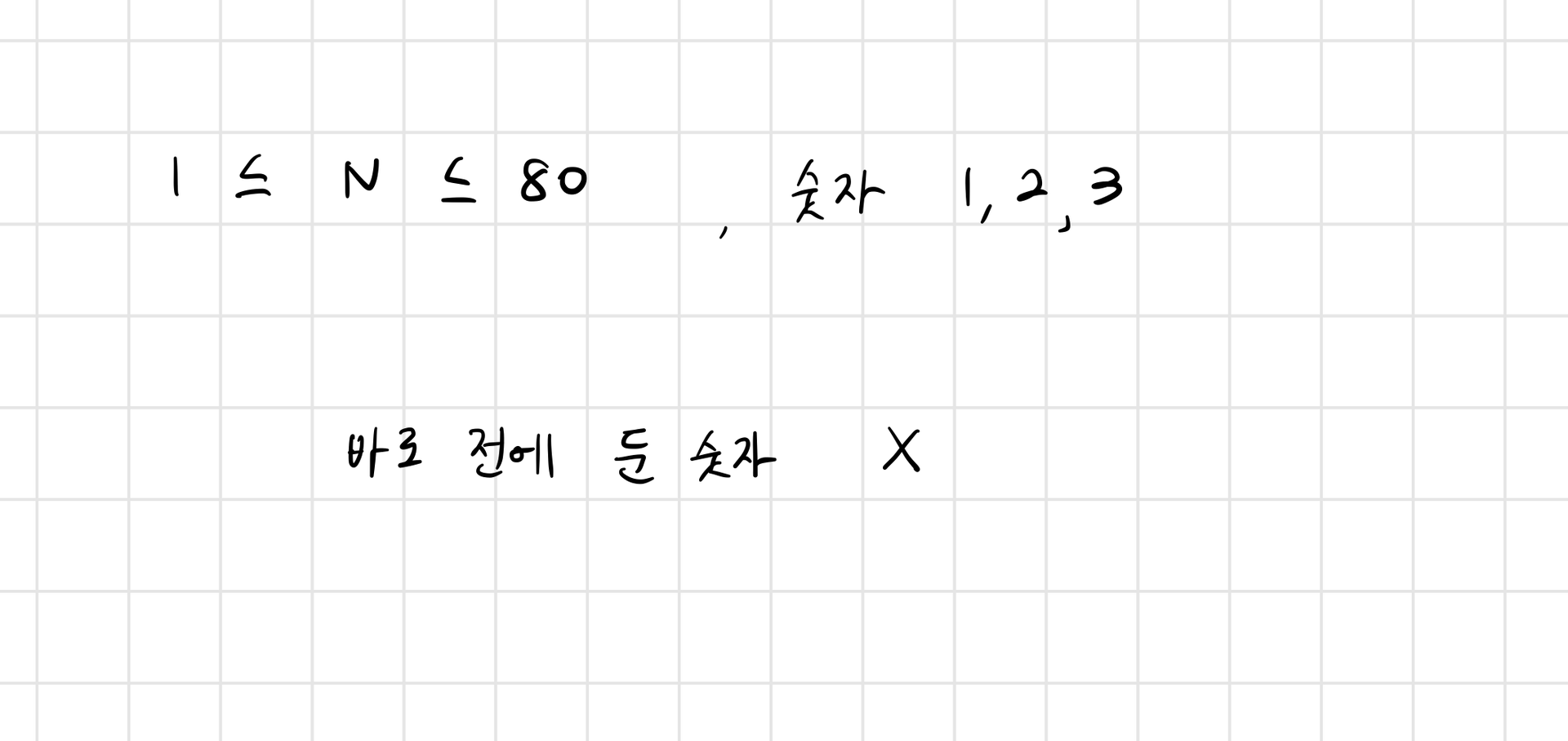 숫자 1, 2, 3으로만 이루어지는 수열이 있다. 임의의 길이의 인접한 두 개의 부분 수열이 동일한 것이 있으면, 그 수열을 나쁜 수열이라고 부른다. 그렇지 않은 수열은 좋은 수열이다.
