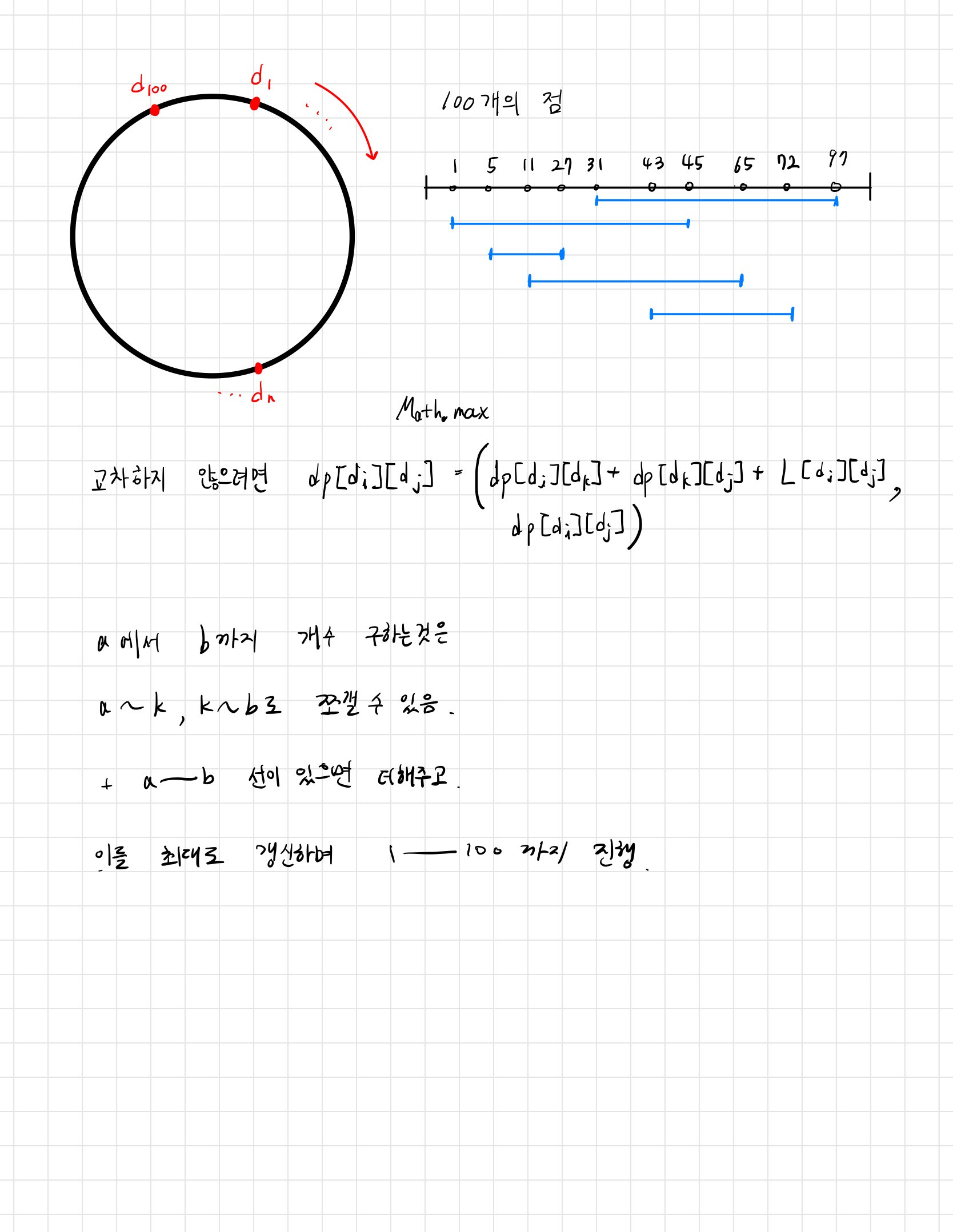 * dp[i][j]를 갱신하려면 dp[i][mid] + dp[mid][j]로 쪼갤 수 있다.