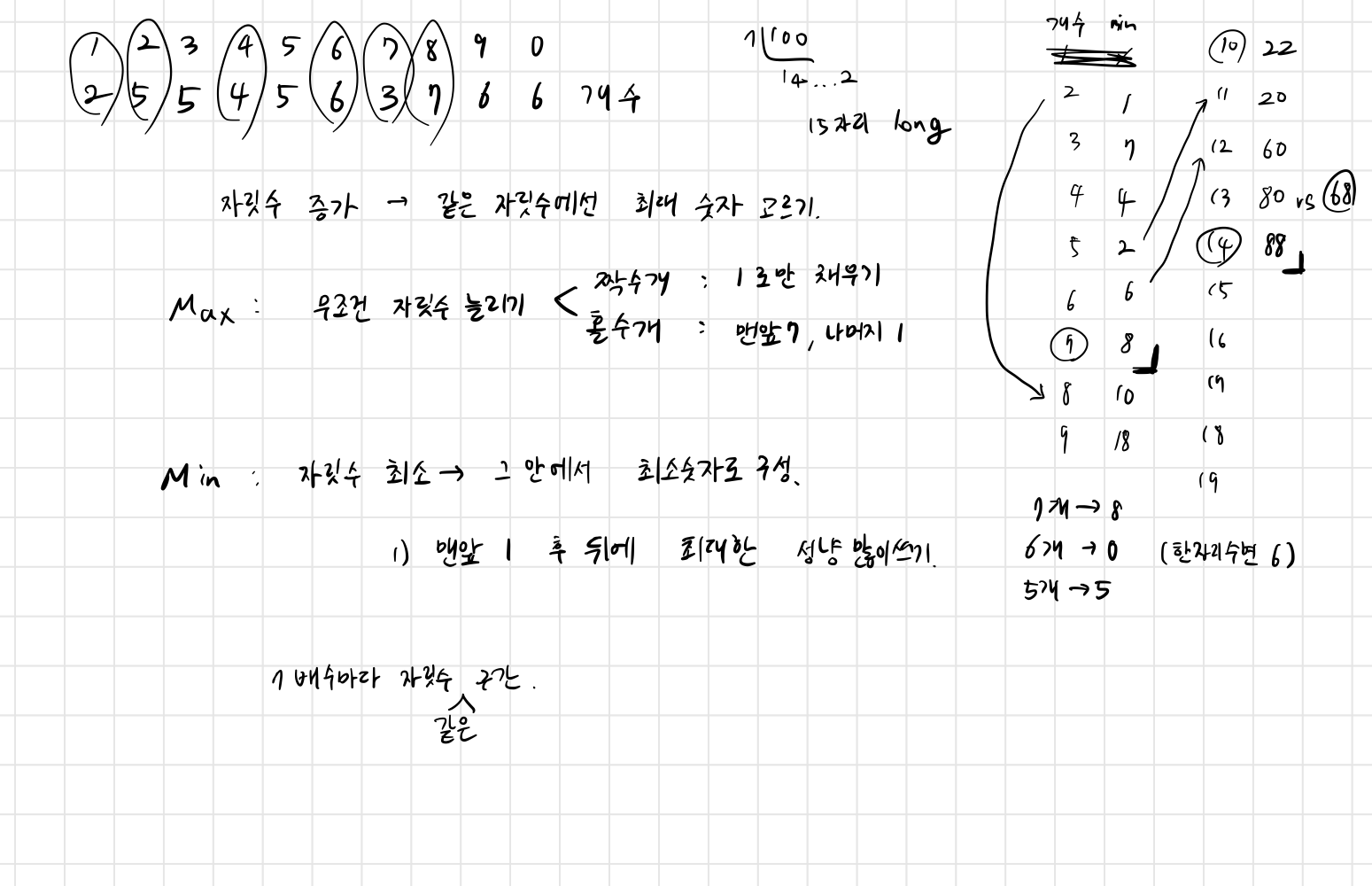 성냥개비의 개수가 주어졌을 때, 성냥개비를 모두 사용해서 만들 수 있는 가장 작은 수와 큰 수를 찾는 프로그램을 작성하시오.