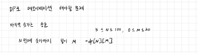 // dp[i][j]: i번째 까지의 숫자로 j를 만드는 경우의 수 (Bottom-Up)