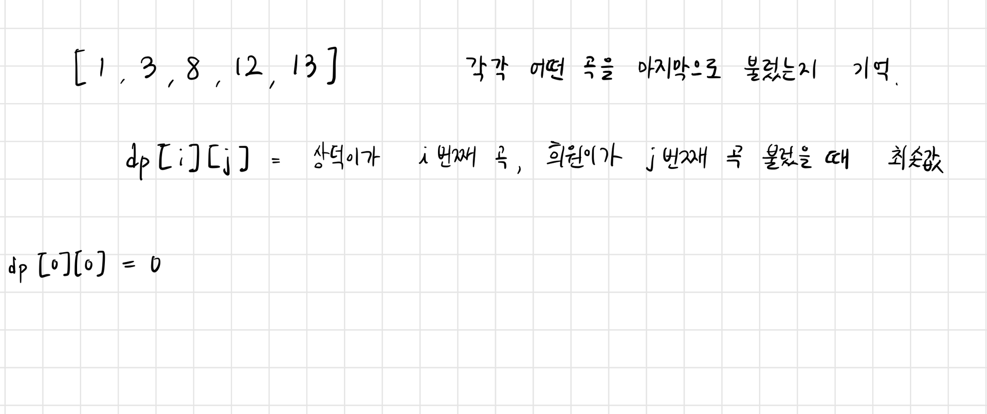 dp[i][j] = 상덕이가 마지막으로 i까지 부르고 희원이가 마지막으로 j까지 불렀을 때 최솟값