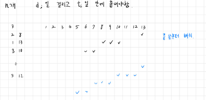 있잖아. 내가 아까 책상에다가 n개의 과제 목록을 적어놨어. 각각의 과제 i는 di 일이 걸리고, 오늘로부터 ti 일 안에 끝내야 해. 그러니까 오늘이 0일이면, ti일이 끝나기 전에 제출이야. 과제는 한번 시작하면 쉬지 않고 계속해야 해. 안 그러면 머리 아파 지거든.