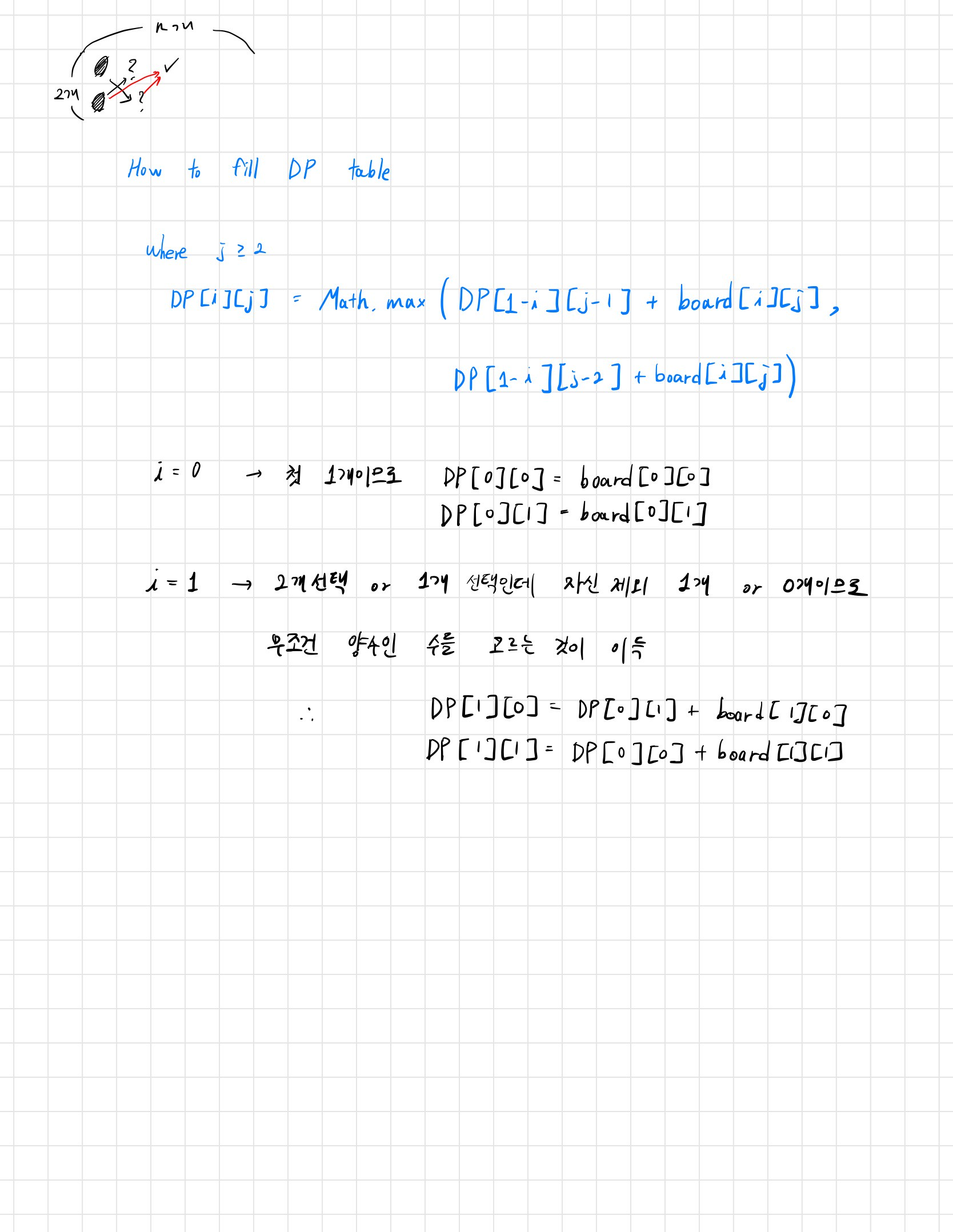 dp[0][k] = Math.max(dp[1][k-1] + board[0][k-1], dp[1][k-2] + board[0][k-1]);