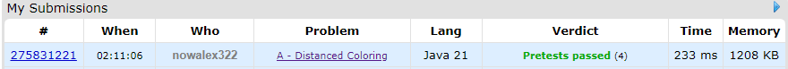 CODEFORCES CONTESTS - EPIC Institute of Technology Round August 2024 (Div. 1 + Div. 2) - Distanced Coloring