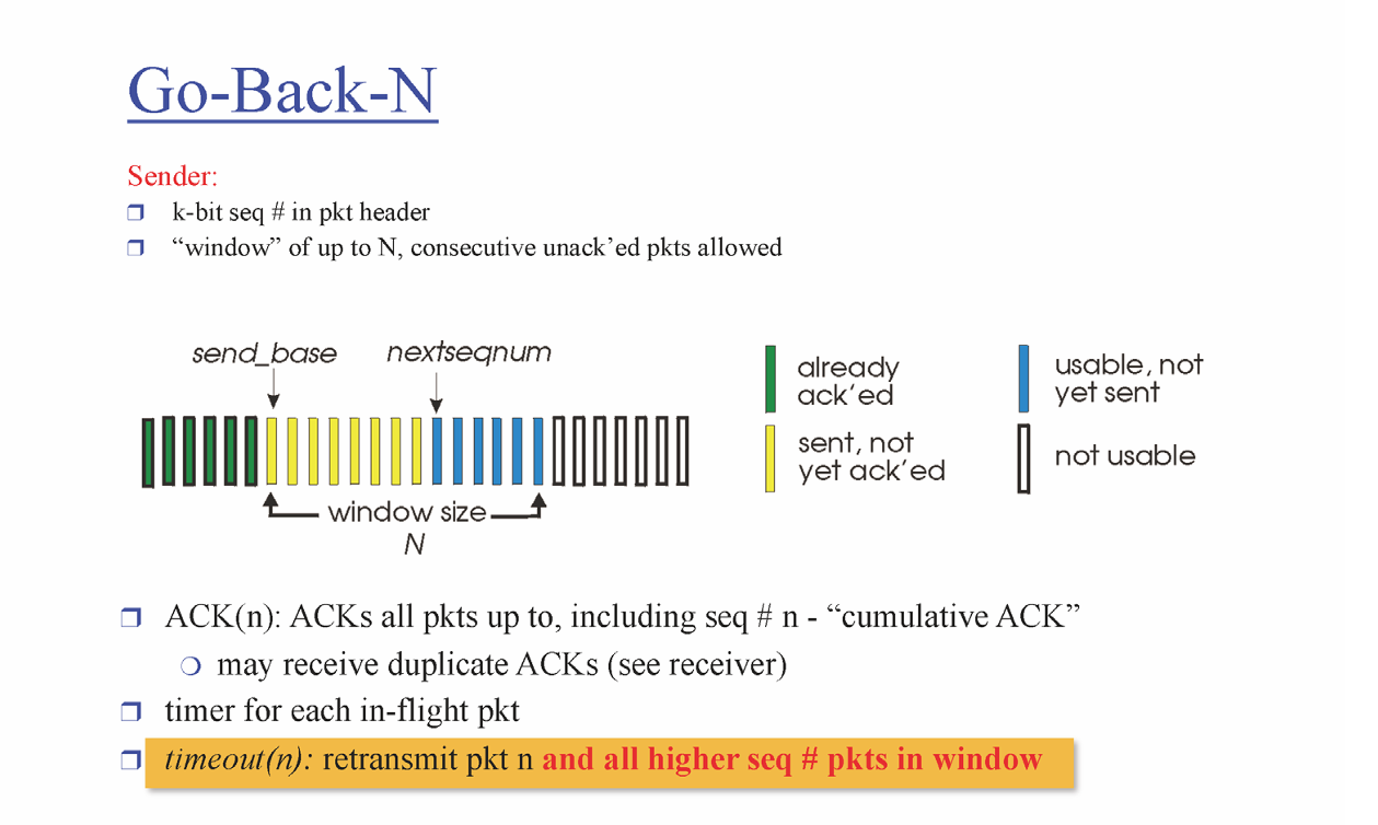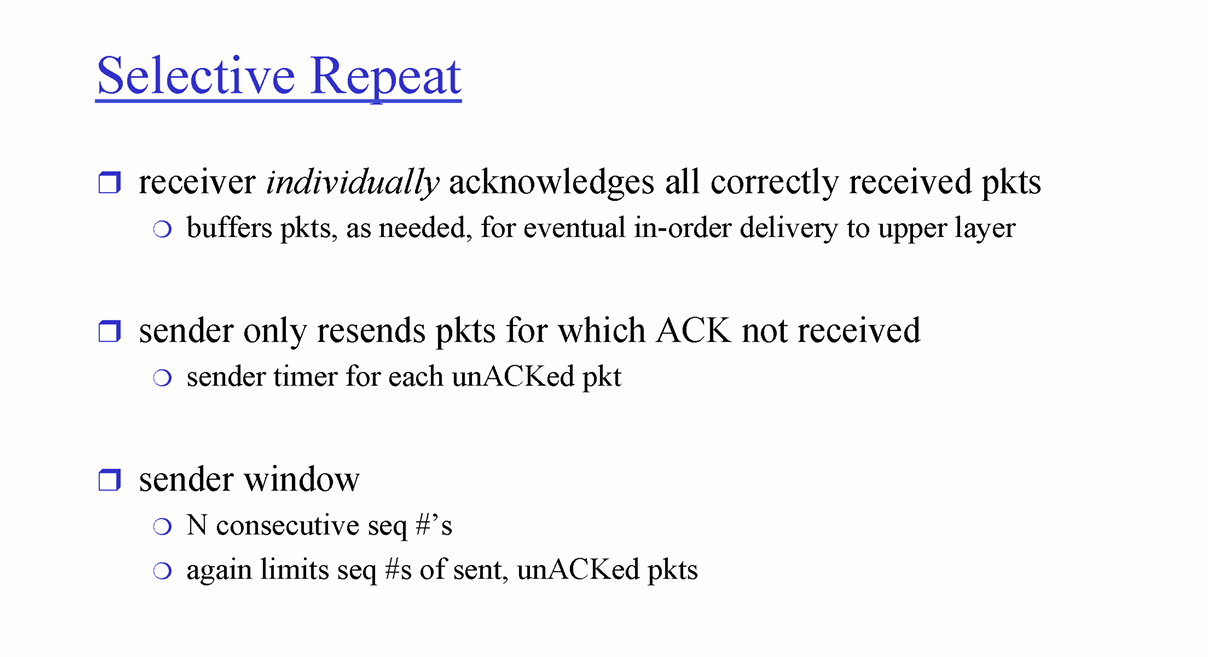 - 단점 : 구현 복잡. Receiver 더 지능적이고 저장공간 많아야한다. Sender 더 복잡. 모든 윈도우 안에있는 패킷마다 타이머를 가져야한다.