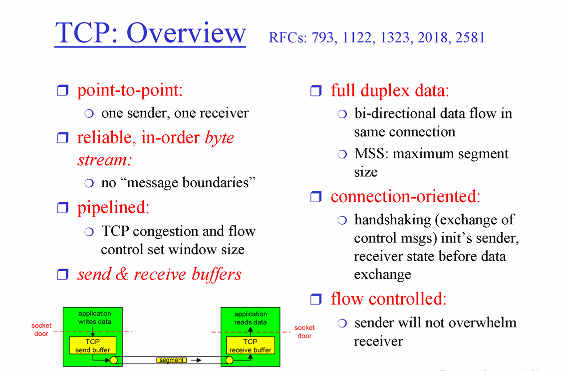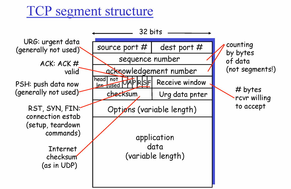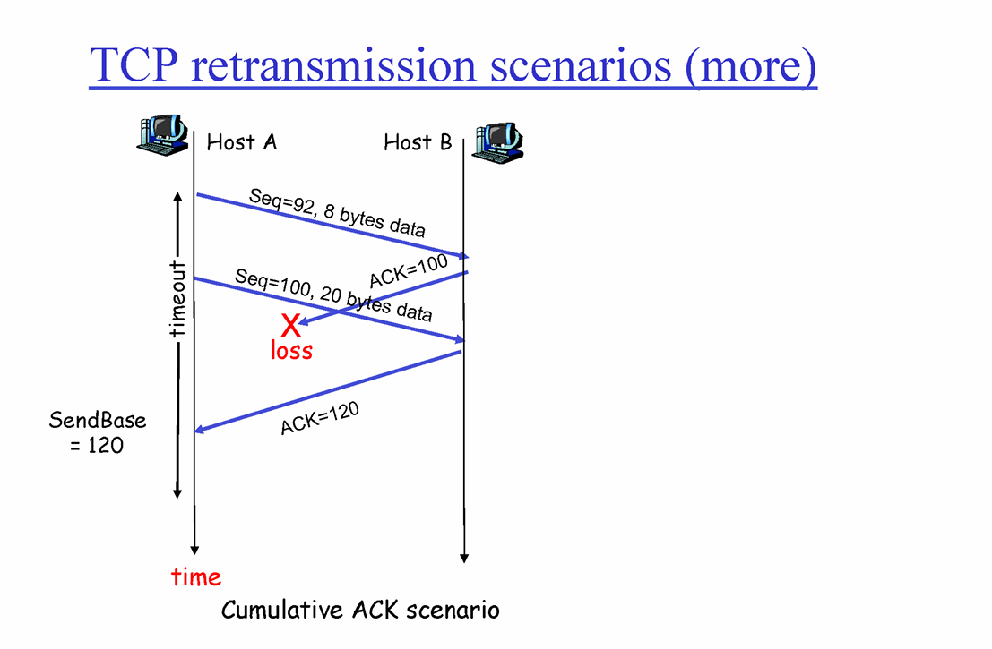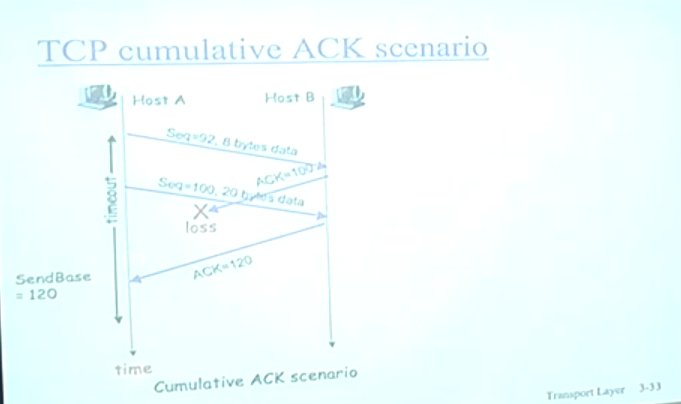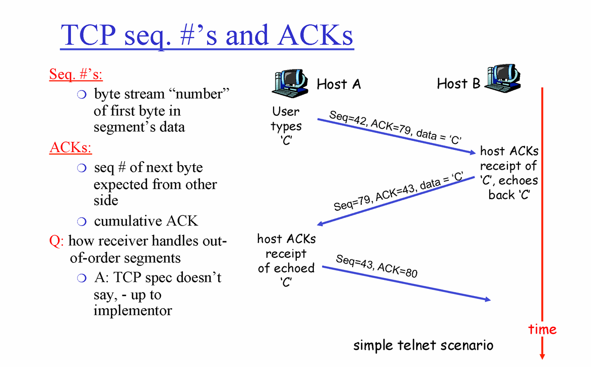 - ACK : cumulative ACK. 사용자A가 보내는 ACK 80 은 79까지 잘 받았고 80번 기다리고 있다는 뜻.
