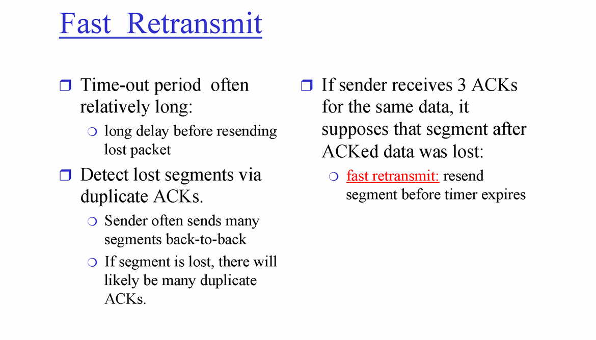 - TCP ACK는 누적이기때문에 중간에 하나 유실된 이후 가는 모든 ACK는 다 유실된 패킷의 Seq#를 가리키기 때문이다.