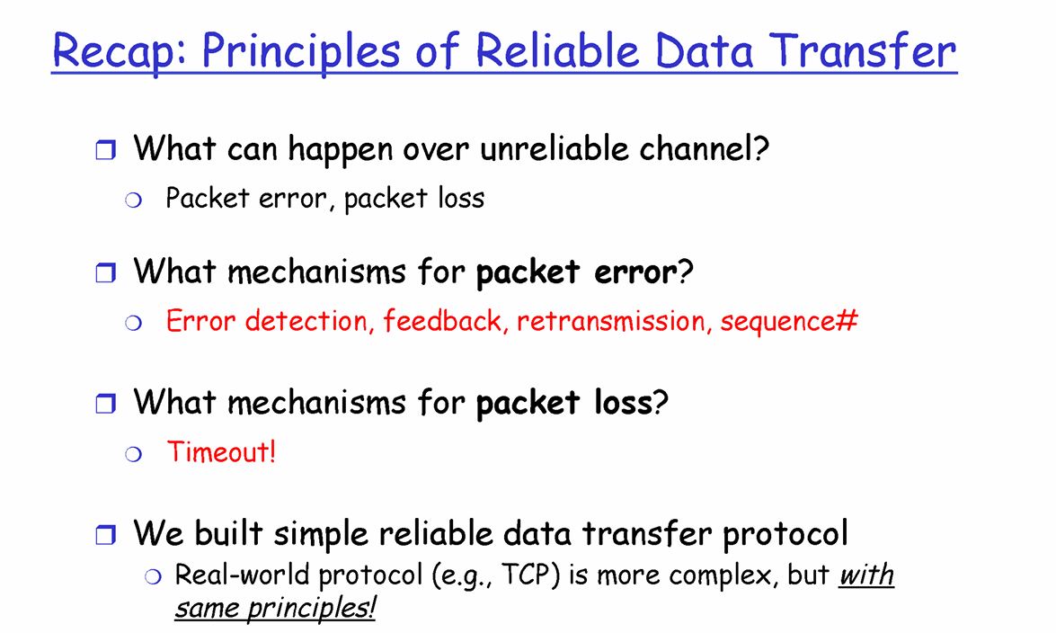 TCP는 패킷 유실에 대처하기위해 Timer 사용. 실제로 timeout 터지면 패킷유실이라고 판단. timeout길이 생각보다 길다. RTT보존값 구한다음 이 값에 마진의 4배해서 매우 넉넉하게 잡아놓는다. 이 계산식은 이전 게시물 참고.