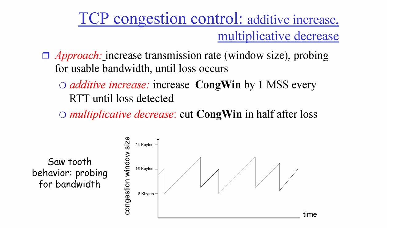 - 3개의 메인 Phase 반복됨 1. Slow Start 2. Additive increase : 3. Multiplicative decrease :