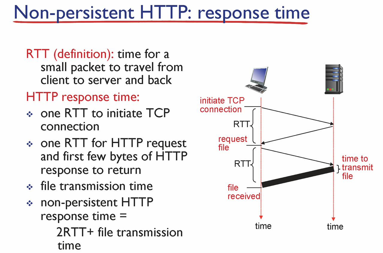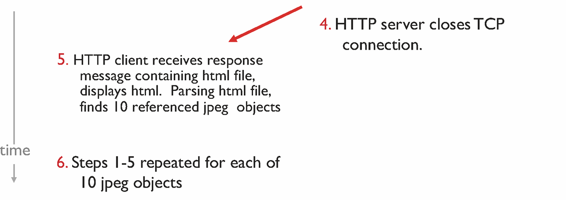 2. HTTP 클라이언트가 HTTP 요청 메시지(URL 포함)를 TCP 연결 소켓으로 전송. 메시지는 클라이언트가 someDepartment/home.index 객체를 원한다고 표시 3. HTTP 서버가 요청 메시지를 수신하고, 요청된 객체를 포함하는 응답 메시지를 생성하여 소켓으로 전송 4. HTTP 서버가 TCP 연결을 종료 5. HTTP 클라이언트가 html 파일이 포함된 응답 메시지를 수신하고 html을 표시. html 파일을 파싱하여 10개의 참조된 jpeg 객체를 발견 6. 1-5단계가 10개의 jpeg 객체 각각에 대해 반복됨
