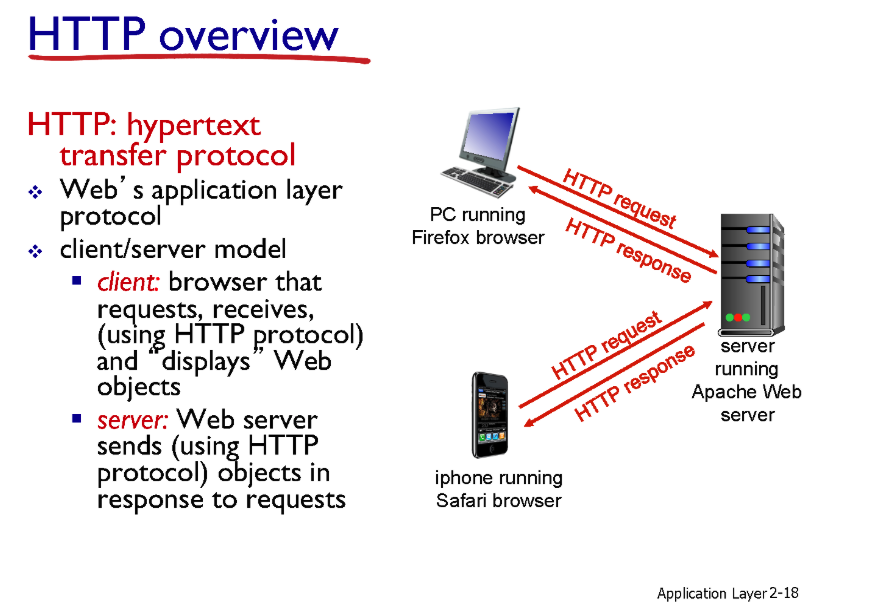 - HTTP request(내가 원하는 하이퍼텍스트 이름)와 HTTP response(요청하는 파일을 찾아서 줌)로 메시지 주고받음.