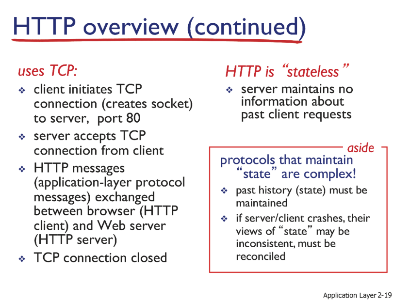 - HTTP는 단순해서 request들어오면 단순히 그 요청에 해당하는 파일을 디스크에서 읽어서 response로 보내주고 끝이다. 이 상태에 대해 기억하지 않고 다음 요청으로 넘어간다.